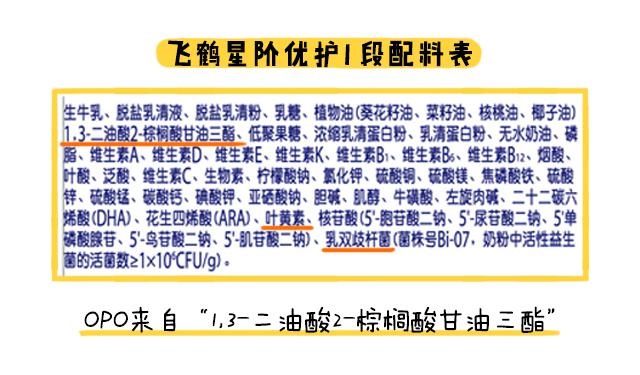 說完常規強化配方,接著說說特色強化配方,特色強化配方指的是國標既沒有規定必須要添加,而且市面上大部分產品也比較少添加的配方。星階優護3個段數添加了OPO、益生菌(乳雙歧桿菌)和葉黃素3個特色強化配方。
