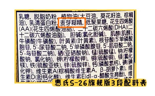 接下來大家看看S-26旗艦版在這3方面有沒有添加比較好吸收的成分,看其配料表,這個奶粉3段和4段添加了麥芽糊精,麥芽糊精是個比較好吸收的碳水化合物。