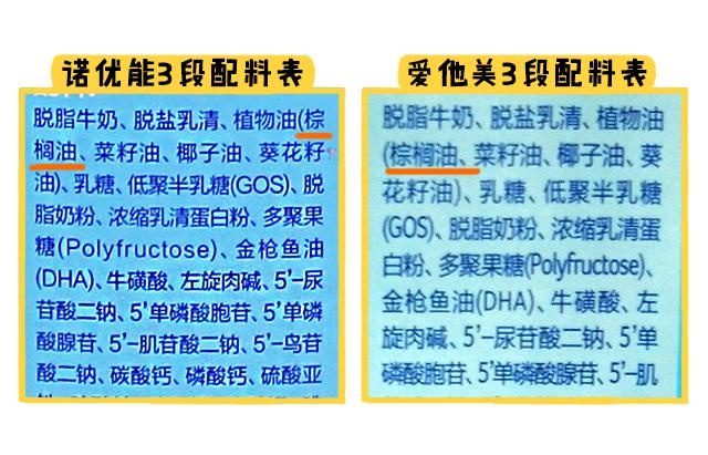 從配料表來(lái)看,這兩個(gè)奶粉都標(biāo)注著含有棕櫚油,棕櫚油是很多奶粉都會(huì)使用到的原料,棕櫚油的棕櫚酸會(huì)與鈣結(jié)合,形成鈣皂,使寶寶大便變硬,增加便秘幾率。