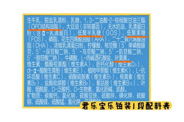 其次在特色強化配方方面(比較少奶粉會添加的營養素),樂鉑裝是添加了OPO、益生元組合(低聚半乳糖+低聚果糖)和葉黃素3個。