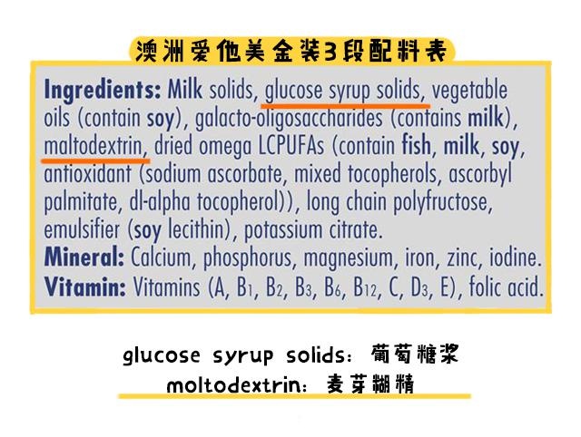 至于愛他美,它3段和4段添加了麥芽糊精和葡萄糖漿,這兩個都是比較好吸收的碳水化合物。