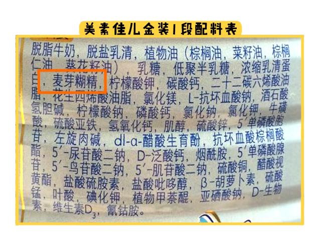 那么我們來看看美素金裝的的配料表,它1段和2段添加了麥芽糊精,麥芽糊精是個很好吸收的碳水化合物。