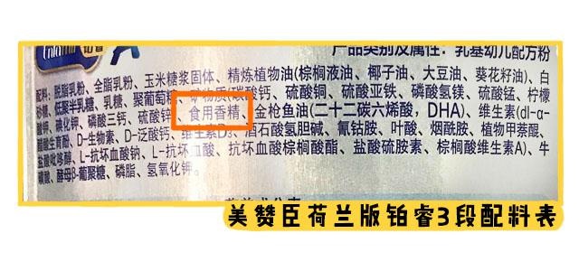 其實美贊臣荷蘭版3段之所以這么香,是因為它添加了香精,大家看下面這個3段配料表就知道了,我已經把香精這個家伙給圈出來了。