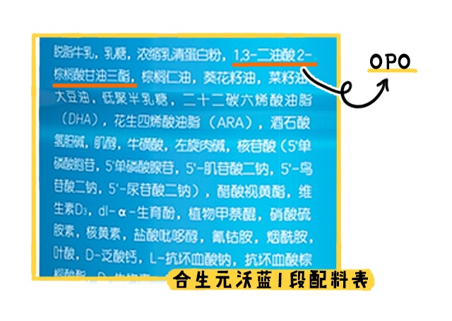 那么下面來看看合生元沃藍的配料表,它3個段數所添加的OPO結構脂在脂肪方面是個比較好吸收的成分。