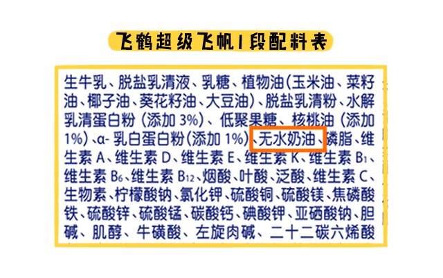 對比完奶源和營養(yǎng),最后來看看原料方面,星飛帆和超級飛帆全段數(shù)都含有無水奶油,它其實不是什么有害物質,只不過它提取自牛乳,由于牛乳脂肪球的直徑比較大,初生寶寶不是太好吸收,大家要留意一下,寶寶大一點就不用擔心這個問題。