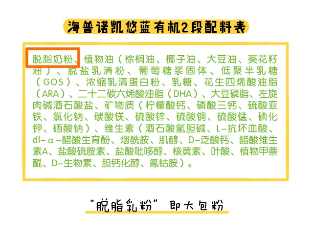 從配料表可以看出,悠藍(lán)有機奶粉的奶基是“脫脂奶粉”,脫脂乳粉也就是我們常說的大包粉,可見它是使用還原奶生產(chǎn)。