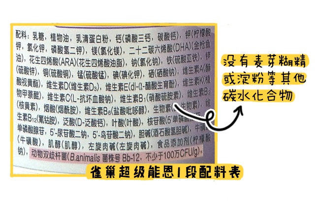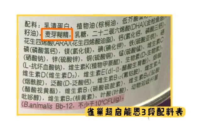 而超啟能恩2段和3段雖然有添加麥芽糊精,不過乳糖在配料表中的位置依然比較靠前,估計添加量也不少。