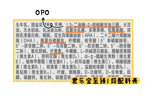 先看看至臻,前面也提到了,至臻添加了OPO,OPO可以有效減少鈣皂的形成,讓寶寶可以更完整的吸收脂肪酸和鈣,還可以軟化大便,降低便秘幾率。此外,至臻還添加有葉黃素、酪蛋白磷酸肽、益生元組合(低聚半乳糖+低聚果糖)。