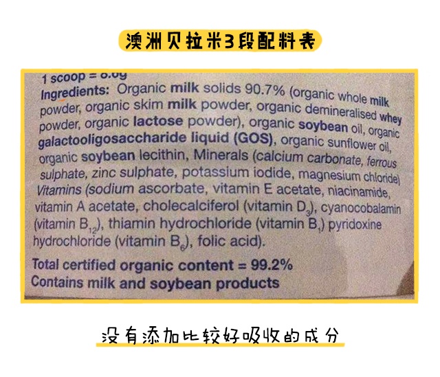 至于判哪款奶粉更好吸收呢,其實看的是碳水化合物、脂肪和蛋白質這3大營養。大家先來看看貝拉米,它的營養配方相當少,這與有機認證相關規定有關。它各個段數都沒有添加對寶寶比較好吸收的成分。