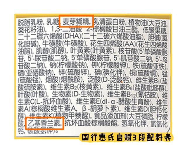 營養和奶源都說完了,最后是原料這部分。兩款奶粉在原料方面的表現都不太令人滿意。啟賦從2段就開始添加了乙基香蘭素,也就是香精,3段除了有香精還額外加入了麥芽糊精。