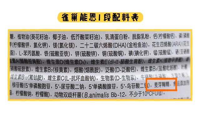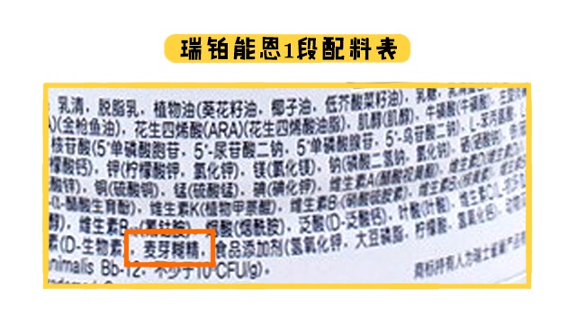 奶源和營養(yǎng)都說完了,最后就是原料這塊。能恩和瑞鉑能恩都是所有段數(shù)都添加了麥芽糊精,麥芽糊精加在奶粉中,會降低乳糖在碳水化合物中的占比,而麥芽糊精的營養(yǎng)價值沒有乳糖高。