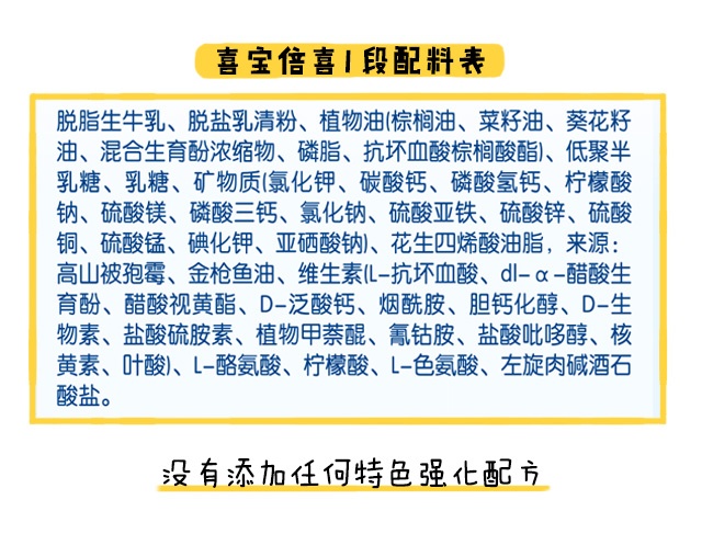 至于特色強化配方,它指的是商家對外宣傳自家產(chǎn)品特別添加進去的營養(yǎng)配方。喜寶全部段數(shù)都沒有添加任何特色強化配方。