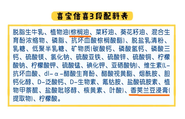 奶源和營養(yǎng)都對比過了,最后是原料方面。喜寶各段數(shù)都含有棕櫚油,3段還額外加入了香精(香夾蘭都浸膏)。