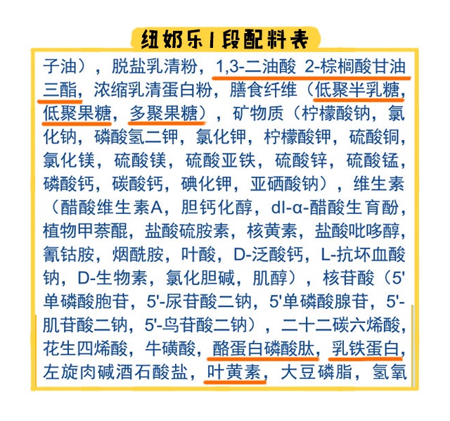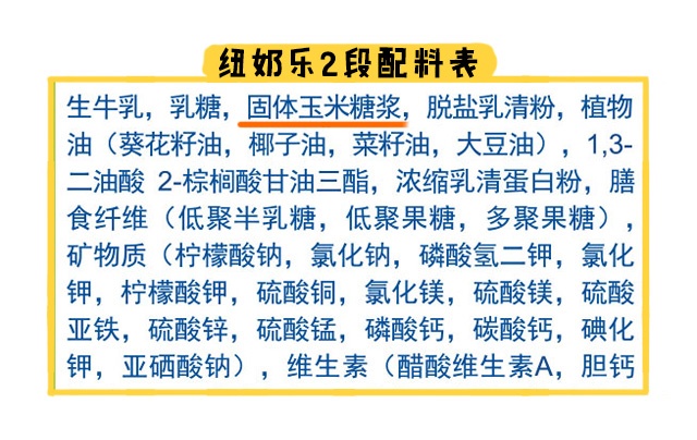 奶源和營(yíng)養(yǎng)都對(duì)比分析過(guò)了,最后來(lái)看看原料這部分。紐奶樂(lè)2段和3段使用了玉米糖漿,大家要注意一下。