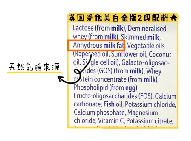 在營(yíng)養(yǎng)配方方面來(lái)看,英國(guó)愛(ài)他美白金版的“白金”,主要是體現(xiàn)在它比普通版多加入了天然乳脂,天然乳脂含有優(yōu)化的脂肪酸結(jié)構(gòu),有助脂肪更完整地被人體吸收,同時(shí)幫助減少鈣皂生成,提高鈣吸收。