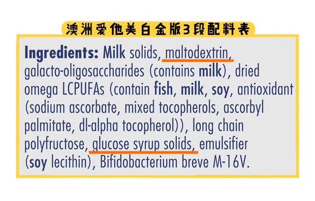 看回奶粉本身,愛他美白金和金裝3段和4段都有添加麥芽糊精和葡萄糖漿,這兩個是比較好吸收的碳水化合物。