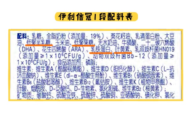至于特色強化配方,它指的是國標既沒有規定要添加,市面上也比較少奶粉會添加的營養素。倍冠全部段數是添加了乳鐵蛋白、益生菌(動物雙歧桿菌)、益生元組合(低聚半乳糖+低聚果糖)和葉黃素。