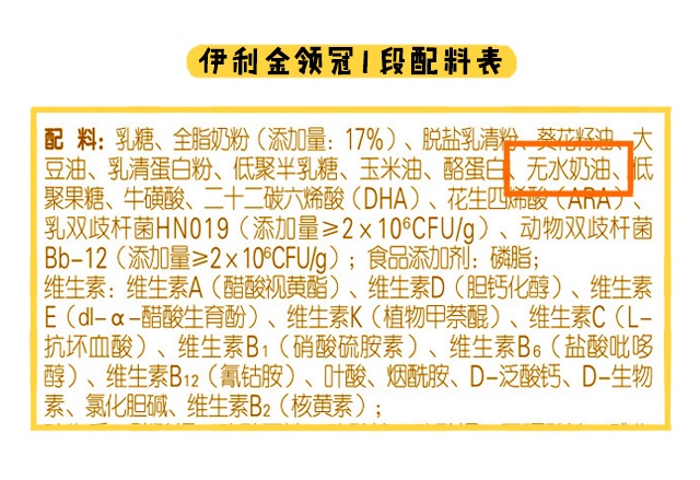奶源和營養都說完了,最后是原料這塊,倍冠和金領冠均添加了無水奶油,無水奶油可以豐富奶粉的脂肪酸種類,但由于它來源于牛乳,前面在奶源那塊我也提到了,牛乳脂肪對初生寶寶來說可能比較難吸收,等寶寶大一點則不用擔心這個問題。