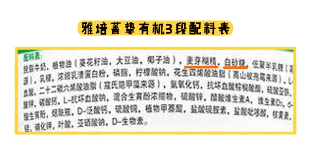 奶源和營養(yǎng)都對比完了,最后看看原料方面。菁摯有機(jī)2段之后添加了麥芽糊精,3段的時候還額外加入了白砂糖。