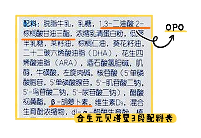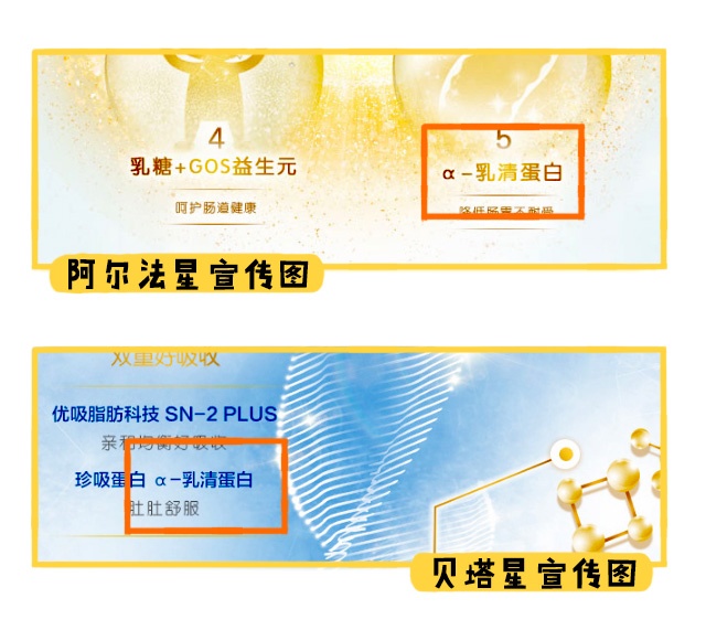 說完常規(guī)強化配方,接著咱們看看特色強化配方,特色強化配方是指國標(biāo)既不規(guī)定添加,是奶粉商家們宣傳自家奶粉特別添加進去的營養(yǎng)配方。阿爾法星和貝塔星的添加情況十分一致,都是1段和2段添加了OPO和α-乳清蛋白,3段再額外添加一個β-胡蘿卜素。