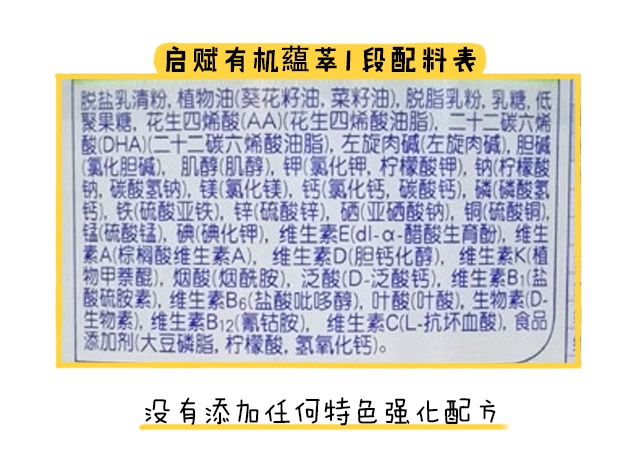 至于特色強化配方,它是指一些商家用作宣傳自己產品特別添加進去的營養素。啟賦有機沒有添加任何特色強化配方。