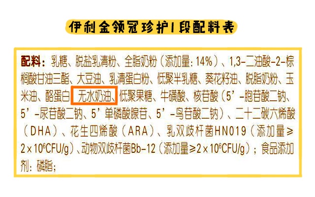 這里要提醒大家注意,金領冠珍護和超級飛帆全段數含有無水奶油,無水奶油的好處在于可以豐富奶粉的脂肪酸種類,但是它提取自牛乳,牛乳脂肪球的直徑較大,對于初生寶寶來說可能比較難吸收。