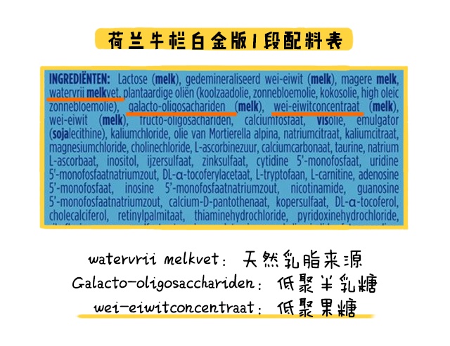 說完常規強化配方,接著還有一種是特色強化配方,它指的是商家們宣傳自家奶粉特別添加進去的營養配方。荷蘭牛欄白金版兩個段數是添加了益生元組合(低聚半乳糖+低聚果糖)和天然乳脂。