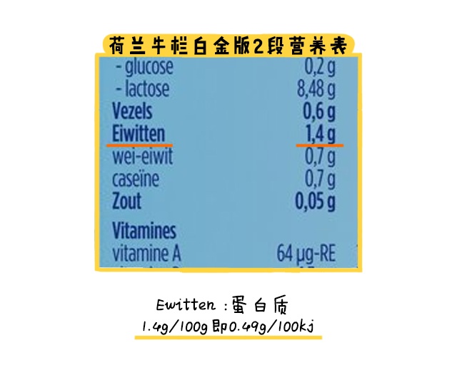 從營養成分表來看,荷蘭牛欄白金版2段的蛋白質含量只添加了1.4/100g,換算成以千焦為單位是0.49g/100kj,達不到國標的最低標準0.7g/100k。所以如果選用這款奶粉的話,要注意在輔食方面適當增加些雞蛋、魚、肉等蛋白質食物。