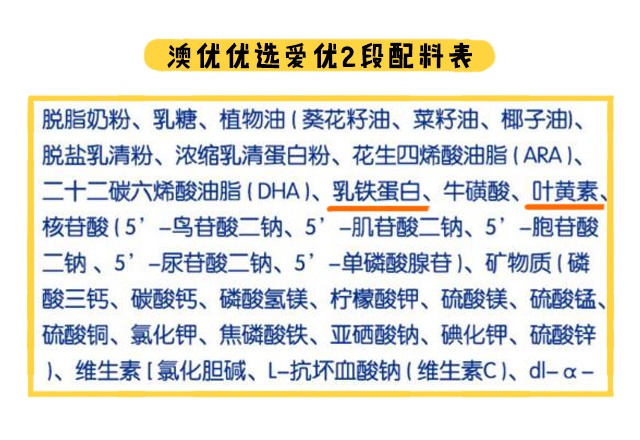 從配料表來看,優選愛優各段數都添加了葉黃素和乳鐵蛋白,葉黃素對寶寶視力的發育有幫助。乳鐵蛋白是母乳的免疫蛋白,能幫助寶寶抵抗細菌、病毒等有害微生物,促進免疫力提高,同時還可以提高貼的鐵的利用率。