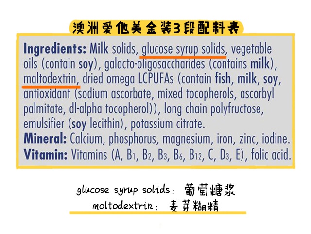 至于澳洲版,它1段和2段都沒有添加比較好吸收的成分,3段和4段則添加有麥芽糊精和葡萄糖漿,它們都是比較好吸收的碳水化合物。