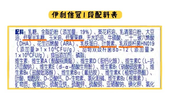 從配料表來看,伊利倍冠營養配方的添加比較理想,各個段數是5個常規強化配方加4個恬適強化配方的搭配,先說說什么是常規強化配方,它指的是一些國標沒有硬性規定要添加,但絕大部分奶粉都會添加的營養素,分別是DHA、ARA、核苷酸、牛磺酸、膽堿和益生元。我用表格記錄了倍冠的添加量,大家可看看。
