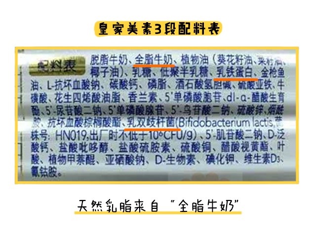 說完常規強化配方,接著說說特色強化配方,它指的是一些商家宣傳自家奶粉特別添加進去的營養素。皇家美素各段數是添加了天然乳脂、乳鐵蛋白和益生菌(乳雙歧桿菌)。