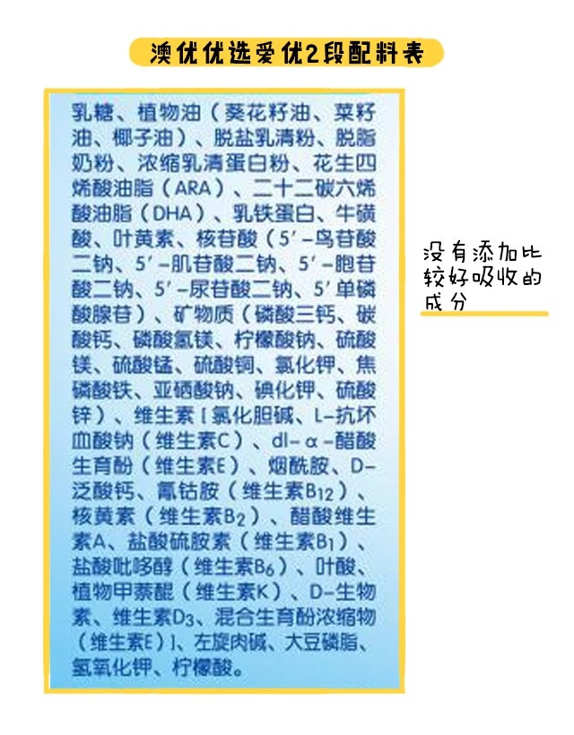 那么我們回到奶粉本身,從配料表來看,優(yōu)選愛優(yōu)各個(gè)段數(shù)都沒有添加任何比較好吸收的成分。