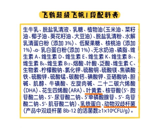 說完常規強化配方,接著說說特色強化配方,它指的是一些商家宣傳自家奶粉特別添加進去的營養素。兩款奶粉的特色強化配方都比較豐富,超級飛帆各段數是添加了乳鐵蛋白、益生菌(動物雙歧桿菌)、葉黃素和水解蛋白。