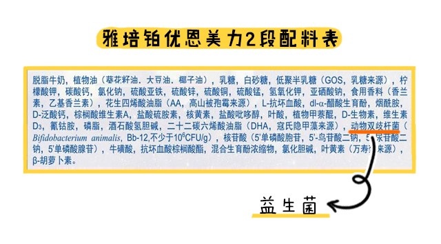 先來看看鉑優恩美力,鉑優恩美力各個段數都添加了益生菌(動物雙歧桿菌)。益生菌是腸道中的有益菌,它可以抑制有害菌的生長,平衡腸道菌群,對于寶寶因腸道菌群失衡而產生的便秘有比較良好的預防和改善作用。