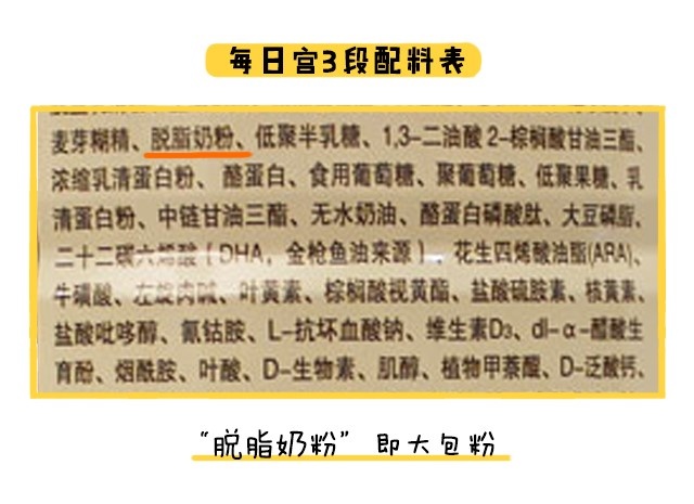 說完每日宮的優點,接著說說它的缺點,每日宮各段數均是使用還原奶生產,還原奶的加工工序比較繁瑣,要先將鮮奶制成大包粉,之后再運到別處重新兌水 成還原奶制成奶粉,經過這樣的折騰,奶粉的新鮮度和營養保留度都不怎么理想。