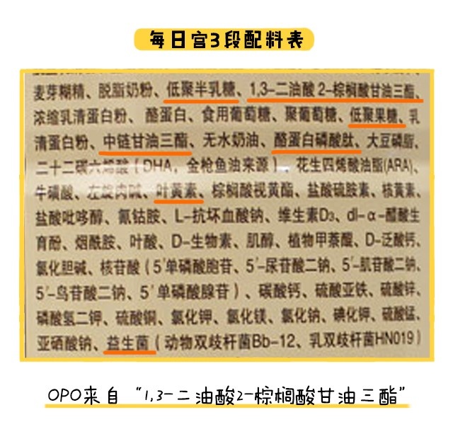 至于特色強化配方,它指的是一些商家宣傳自家奶粉特別添加進去的,區別于其他品牌的營養素。每日宮各段數是添加了OPO、中鏈甘油三酯、水解蛋白、酪蛋白磷酸肽、益生菌、益生元組合(低聚半乳糖+低聚果糖)和葉黃素。