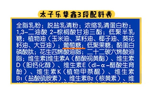 摯鑫的表現相對好一些,1段和2段都沒有添加需要特別注意的原料成分,但3段加入了葡萄糖,葡萄糖的添加降低了碳水化合中營養價值更高的乳糖的占比。