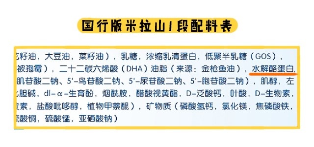 那么回到奶粉本身,從配料表來看,米拉山各段數都添加了少量水解蛋白。可能有些媽媽對水解蛋白這個配方沒什么概念,是這樣的,由于有一些寶寶在免疫和消化系統還沒有發育成熟的時候,不能夠很好的消化和吸收奶粉中的蛋白質,以致于身體會出現一些過敏癥狀,比如濕疹、便秘、吐奶等等。而水解我們可以將它理解成是將蛋白質切成一小段一小段,這樣可以降低蛋白質的致敏性,寶寶能更容易消化和吸收。