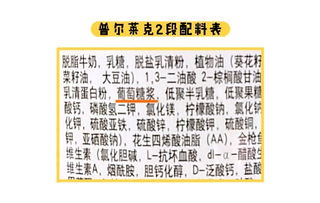 奶源和營養都說完了,最后是原料方面。普爾萊克2段之后加入了葡萄糖漿,葡萄糖漿的添加會降低碳水化合物中乳糖的占比,而它的營養價值比不上乳糖。
