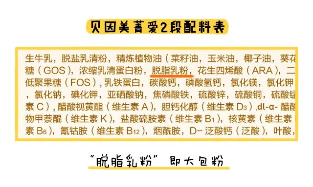先看看奶源方面,菁愛采用中國奶源,1段奶基是鮮奶,不過2段之后就摻入了大包粉兌水的還原奶,還原奶的加工工序比鮮奶繁瑣,奶粉受到二次污染幾率更高,營養素的流失也更加多。