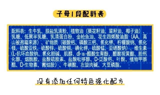 至于特色強化配方,它指的是一些商家宣傳自家奶粉特別添加進去的,區別于其他品牌的營養素。從配表來看,子母全部段數都沒有添加任何特色強化配方。
