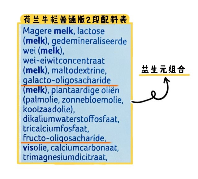 從配料表來看,荷蘭牛欄中國版和荷蘭版各個段數都添加了“低聚半乳糖+多聚果糖”這個益生元組合。