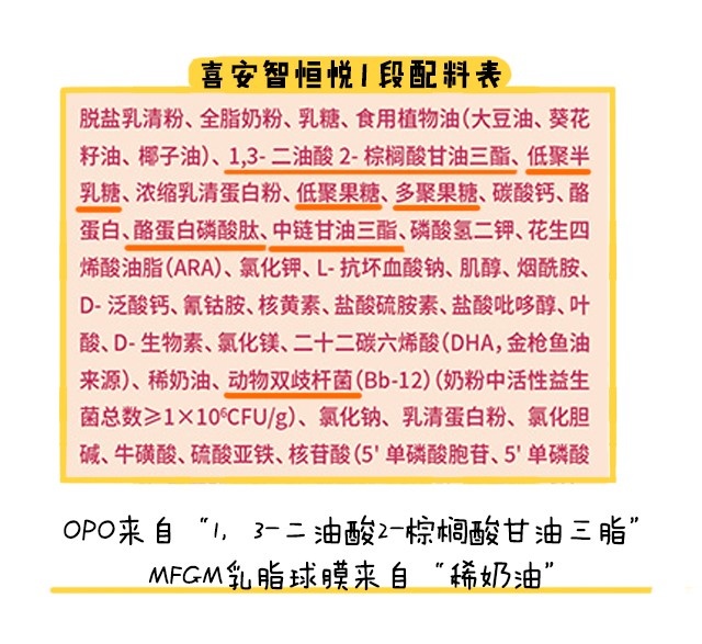 至于恒悅,它添加的特色強化配方比較多,足足添加了益生元組合、益生菌、OPO、水解蛋白、酪蛋白磷酸肽、中鏈甘油三酯和MFGM乳脂球膜足足7個。