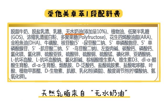 從配料表來(lái)看,愛(ài)他美卓萃各段數(shù)都添加了天然乳脂,天然來(lái)源的乳脂含有優(yōu)化的脂肪酸結(jié)構(gòu),有助脂肪更完整地被寶寶吸收,同時(shí)幫助減少鈣皂生成,提高鈣的吸收率。