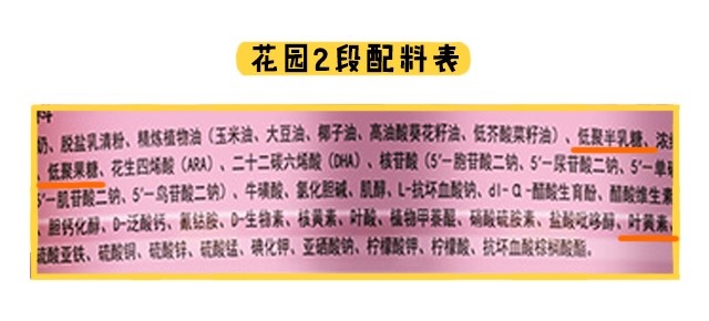 至于特色強化配方,它指的是一些商家宣傳自家奶粉特別添加進去的,區別于其他品牌的營養素。花園各段數是添加了葉黃素和益生元組合(低聚半乳糖+低聚果糖)。