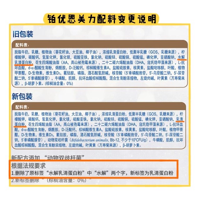 而鉑優恩美力1段添加有少量水解蛋白,(奶粉新政規定配料表中不能標注“水解”兩個字,所以只標注了“乳清蛋白粉”)。