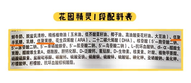 其二,在特色強化配方方面,特色強化配方指的是一些商家宣傳自家奶粉特別添加進去的,區別于其他品牌的營養素。花園精靈各段數只添加了“低聚半乳糖+低聚果糖”這個益生元組合,