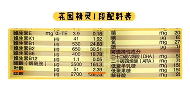 其三,在基礎營養方面,基礎營養是指奶粉的碳水化合物、脂肪、蛋白質、維生素和礦物質。大家平時所說的這款奶粉營養夠不夠,其實主要就是看這些基礎營養,而不是DHA那些強化配方,只要基礎營養都達標了,就不用擔心寶寶的營跟不上。花園精靈1段所添加的葉酸是2.39ug/100kj ,低于國標最低標準2.5 ug/100kj 。