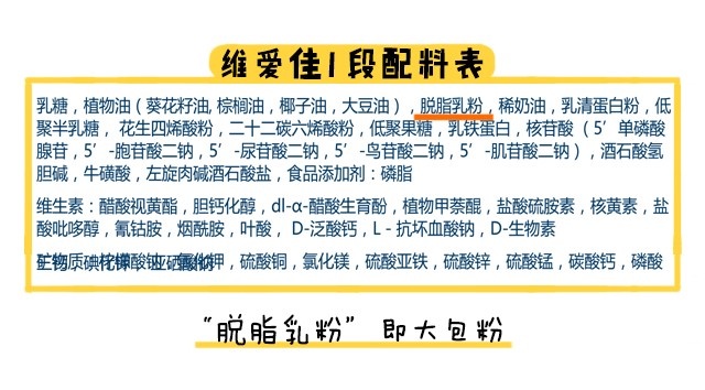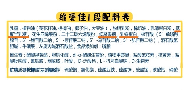 至于特色強化配方,它是指一些商家宣傳自家奶粉特別添加進去的,區別于其他品牌的營養素。維愛佳各段數是添加了益生元組合(低聚半乳糖+低聚果糖)和乳鐵蛋白。